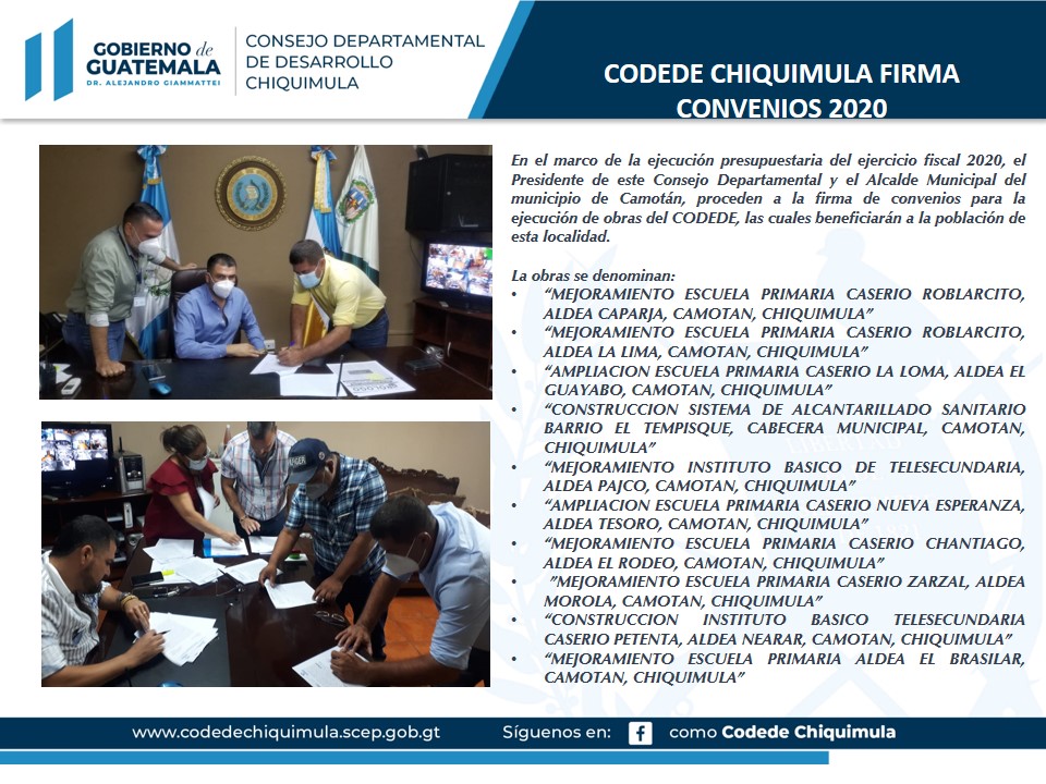En el marco de la ejecución presupuestaria del ejercicio fiscal 2020, el Presidente de este Consejo Departamental y el Alcalde Municipal del municipio de Camotán, proceden a la firma de convenios para la ejecución de obras del CODEDE, las cuales beneficiarán a la población de esta localidad.